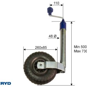 Stödhjul Ø48mm med stålfälg. Luftgummihjul 260x85mm. Belastning 136kg